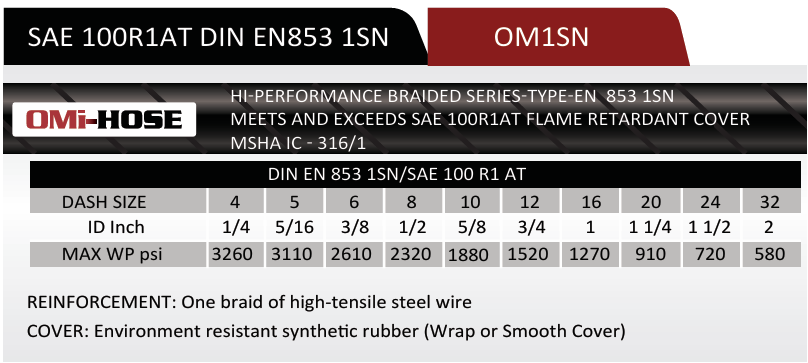 1SN-16 | 1" 1SN Braided Hydraulic Hose, 1270 Max WP PSI